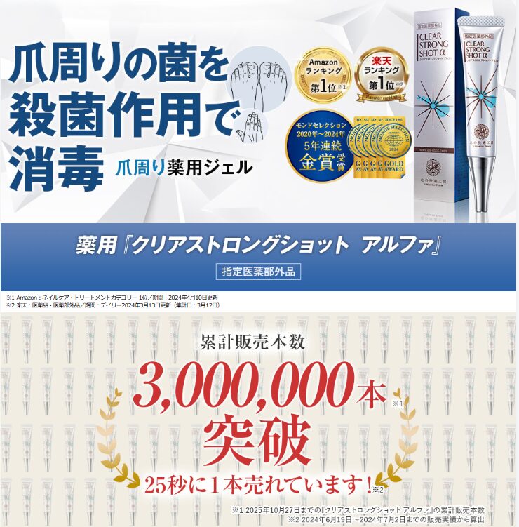約1分で申込完了|変更・休止いつでもOK 今すぐ初回特別価格で始める クリアストロングショット アルファが選ばれる理由 有効成分が爪の奥まで浸透し、繰り返す爪トラブルを根本からケア。 ・有効成分配合の薬用処方 ・浸透力にこだわった独自設計 ・自宅で簡単に塗るだけケア ・ベタつきにくく使いやすい ・定期コースでお得に継続可能 サンダルや素足に自信が持てる美しい爪へ。人前でも気にならない健やかな指先を目指せます。 商品名 クリアストロングショット アルファ カテゴリ 美容 関連記事 BI-SU(ビース)薬用トリートメント(医薬部外品) サンパラソル アスリート(SUNPARASOL athlete) REGLAGE ピュアRTセラム ハリッチ プレミアムリッチプラス マイナチュレ薬用スカルプシャンプー〈エコ定期〉 マイナチュレ スカルプフローラブースター〈定期コース〉 KATAN CICA DERMA HIT SERUM 10