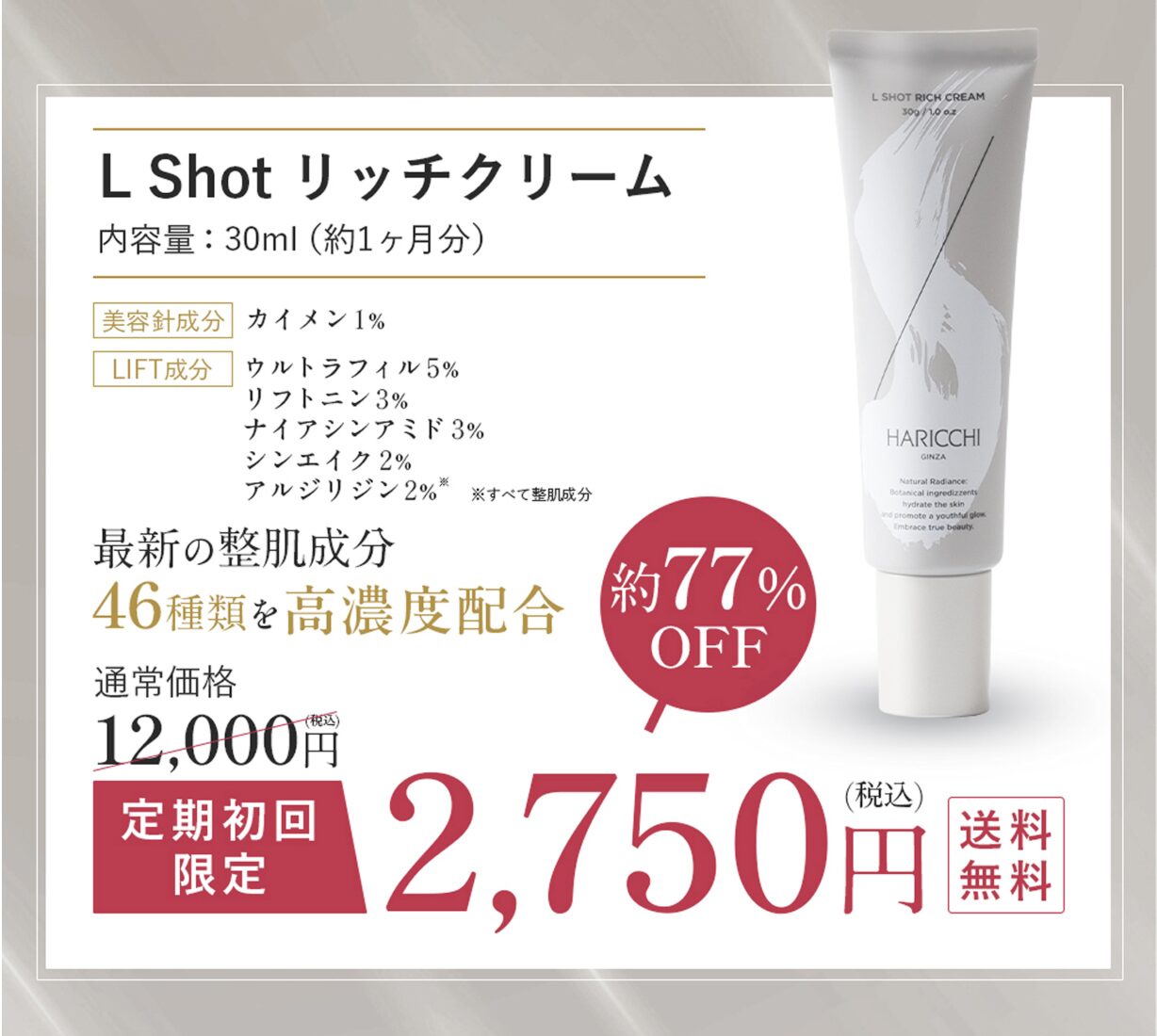 今だけ限定|約30秒で申込完了・簡単ケア 今すぐハリ肌を取り戻す 顔もボディも“年齢サインまとめてケア” 話題の針入りクリームで、気になる部分に直接アプローチ ・ほうれい線だけでなく全身に使える ・針状成分が肌に密着し集中ケア ・乾燥・ハリ不足・年齢サインに対応 ・気になる部分にピンポイント使用OK →顔だけでなく首・手元・ボディまで若々しい印象へ →年齢が出やすいパーツもまとめてケアできる 商品名 ハリッチ L Shot リッチクリーム カテゴリ コスメ,ヘアケア,ボディケア 関連記事 Ekiスキンベールプライマー レチベビー(RETIBABY)