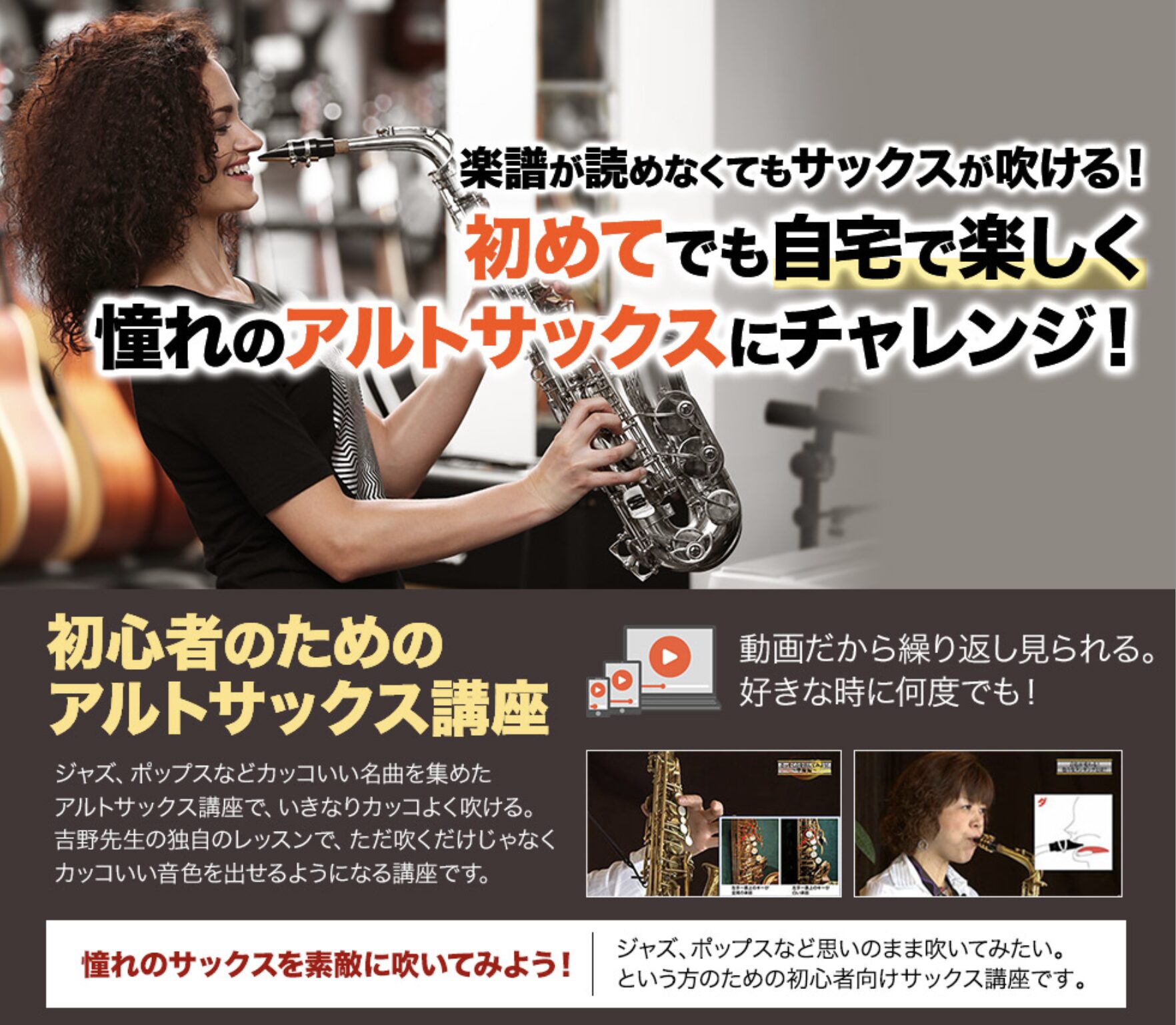 吉野先生の初めてのアルトサックス講座は、音楽経験ゼロでも始めやすい初心者向けの教材です。