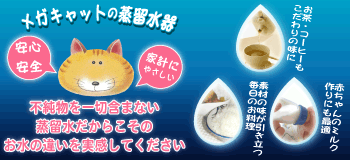 メガキャットジャパンは、メガホーム社製の家庭用蒸留水器を扱う正規日本代理店です。n1回で最高4リットルの蒸留水を作りやすく、水道水から毎日の飲み水をまとめて用意しやすいのが魅力です。
