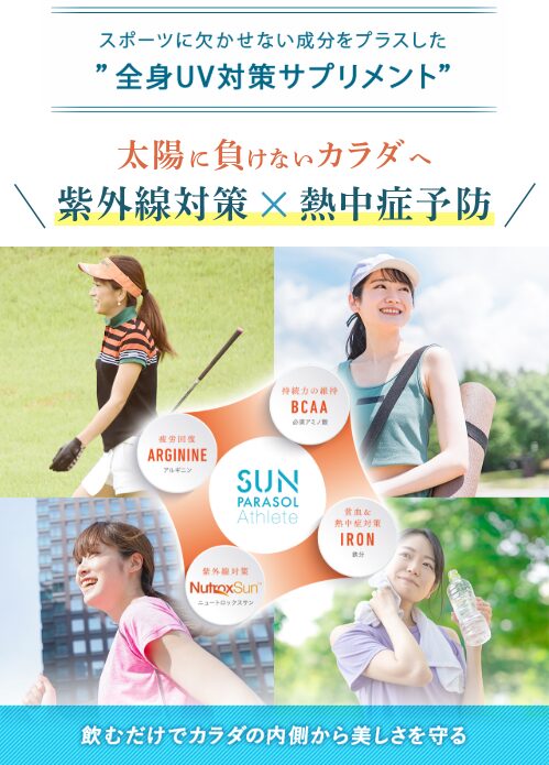紫外線は365日、あなたの肌に降り注いでいます。サンパラソル アスリートは、体の内側から紫外線ダメージにアプローチする美容サプリ。塗り直し不要で、忙しい日でも簡単に続けられます。